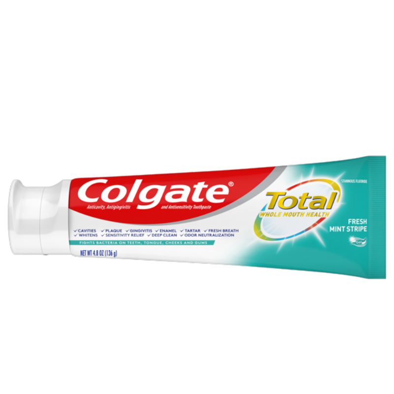 - Le dentifrice Colgate Total SF Fresh Mint a une formule révolutionnaire qui combat les bactéries sur les dents, la langue, les joues et les gencives pour la santé de toute la bouche. Colgate Total avec fluorure stanneux offre également plus d'avantages que jamais, notamment un soulagement de la sensibilité, une meilleure résistance de l'émail* et une neutralisation des odeurs* (*basé sur des études in vitro).