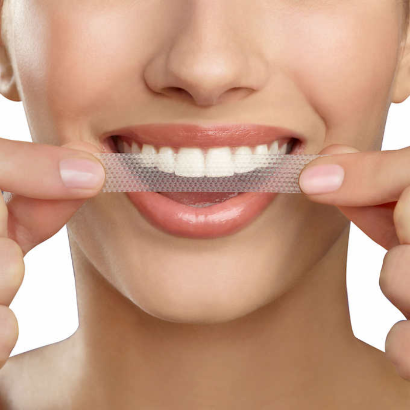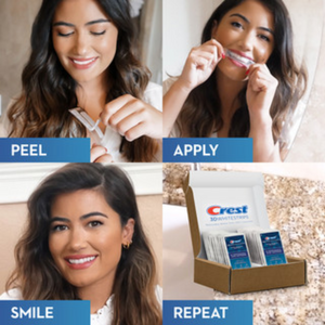 1. PEEL : décollez les bandes blanches du support. 2. APPLICATION : À l'aide d'un miroir, appliquez le côté gel de la bande sur les dents de devant. Alignez le bord droit de la bande avec la gencive. Repliez les dents et appuyez pour les fixer. 3. SOURIRE : Décollez d’abord l’arrière des dents pour faciliter le retrait. ©Procter & Gamble