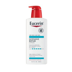 - Eucerin Intensive Repair Body Lotion restaure immédiatement l'éclat de la peau et offre une hydratation 24h/24. Cette lotion Eucerin Intensive Repair contient une formule tridimensionnelle unique enrichie en Alpha Hydroxy et en facteurs hydratants naturels, et hydrate, exfolie et revitalise les peaux très sèches et squameuses. La formule intensément hydratante de cette lotion pour le corps non parfumée améliore immédiatement l'apparence de la peau. Cette lotion pour le corps sans parfum pour peau sèche est sans colorant ni parabène, elle est donc idéale pour les peaux sensibles et est suffisamment douce pour être utilisée comme lotion réparatrice quotidienne pour la peau sèche. Cette crème hydratante pour le corps est parfaite comme lotion pour les peaux très sèches et peut également être utilisée comme lotion pour les mains ou les pieds. Pour l'utiliser, appliquez quotidiennement cette lotion pour peau sensible Eucerin sur votre corps.