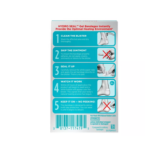 - Les coussinets anti-ampoules hydrocolloïdes de marque BAND-AID ® HYDRO SEAL ® aident à garder les germes à l'extérieur et le pouvoir de guérison naturel de votre corps à l'intérieur. Dans les 24 heures suivant l'application, une bulle blanche se formera sous le pansement pour montrer que le processus de guérison a commencé . Ces bandages hydrocolloïdes imperméables offrent un soin avancé des plaies et un coussin pour aider à protéger les ampoules sur les pieds et les talons. Le rembourrage offre une protection et un soulagement des ampoules et des plaies douloureuses. Idéales pour une utilisation sur les talons, les plaquettes thermoformées offrent une protection de plusieurs jours et restent en place même sous la douche. Ce paquet contient 6 bandages en gel emballés individuellement, chacun mesurant 1,1 x 2,1 pouces.