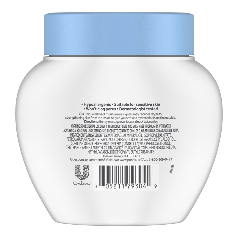 Mélange unique d'hydratants @ponds réduit considérablement la sécheresse, renforçant la peau de l'intérieur pour la laisser douce et hydratée à l'extérieurHydratation richeHypoallergéniqueConvient aux peaux sensiblesN'obstrue pas les poresTestées dermatologiquement